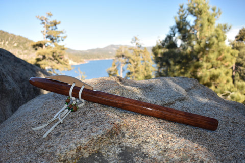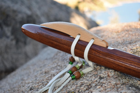 Featured is a hand crafted Native American Style, 6-hole flute in the key of A by Dave McGiffin. The flute is made from Babinga. The bird is crafted from Sitka Spruce and attached with white colored deer hide, glass and/or metal beads. The bore is 7/8” the overall length is 19-1/4”. The flute has been dipped in tung oil to help protect from moisture on the inside and several coats have been applied on the outside as well. This flute has a very clear and beautiful sound.