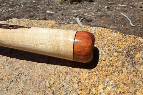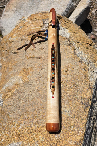 Featured is a hand crafted Native American Style, 6-hole flute in the key of high F# by Dave McGiffin. The flute is made from Ambrosia Maple and Aromatic Red Cedar. The bird is crafted from Aromatic Red Cedar and attached with brown colored deer hide, glass and/or metal beads. The bore is 7/8” the overall length is 21-3/4”. The flute has been dipped in tung oil to help protect from moisture on the inside and several coats have been applied on the outside as well. This flute has a very clear and beautiful sound.