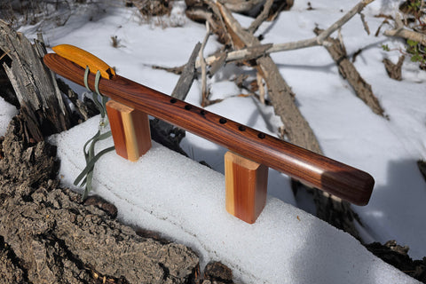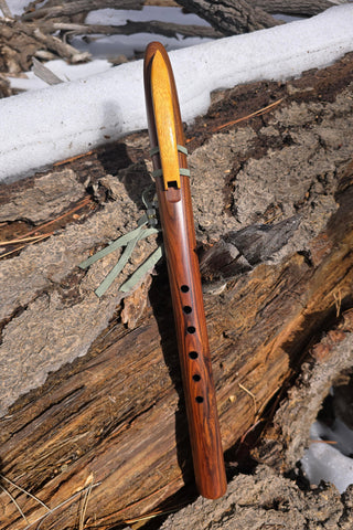 Featured is a hand crafted Native American Style, 6-hole flute in the key of G by Dave McGiffin. The flute is made from Bolivian Rosewood. The bird is crafted from Canarywood and attached with sage colored deer hide, glass and/or metal beads. The bore is 7/8” the overall length is 20-1/2”. The flute has been dipped in tung oil to help protect from moisture on the inside and the outside has been hand rubbed with bees wax, giving a matt finish. This flute has a very clear and beautiful sound.