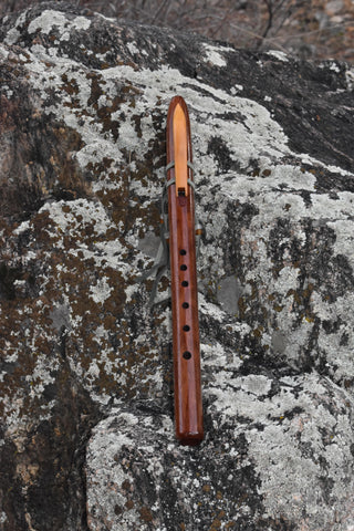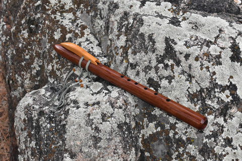 Featured is a hand crafted Native American Style, 6-hole flute in the key of A by Dave McGiffin. The flute is made from Bubinga. The bird is crafted from Osage Orange and attached with sage colored deer hide, glass and/or metal beads. The bore is 7/8” the overall length is 19”.  The flute has been dipped in tung oil to help protect from moisture on the inside and several coats have been applied on the outside as well. This flute has a very clear and beautiful sound.