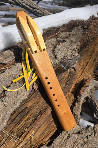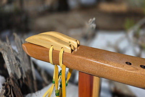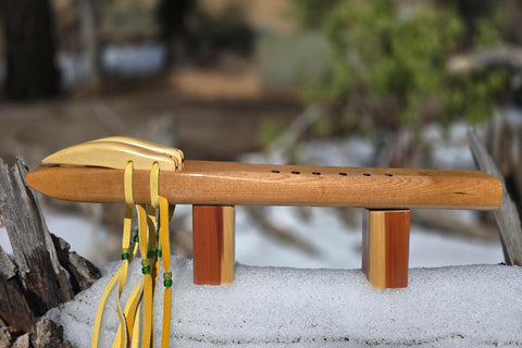 Featured is a hand crafted Native American Style, 6-hole, Drone flute in the key of high G by Dave McGiffin. The flute is made from Cherry. The birds are crafted from Alaskan Yellow Cedar and attached with gold colored deer hide, glass and/or metal beads. The bore is 7/8” the overall length is 20-1/4”.  The flute has been dipped in tung oil to help protect from moisture on the inside and several coats have been applied on the outside as well. This flute has a very clear and beautiful sound.