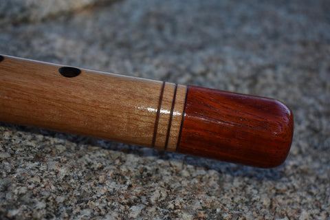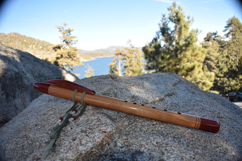Featured is a hand crafted Native American Style, 6-hole flute in the key of A by Dave McGiffin. The flute is made from Cherry & Paduka. The bird is crafted from Paduka and attached with sage colored deer hide, glass and/or metal beads. The bore is 7/8” the overall length is 19-1/4”.  The flute has been dipped in tung oil to help protect from moisture on the inside and several coats have been applied on the outside as well. This flute has a very clear and beautiful sound.